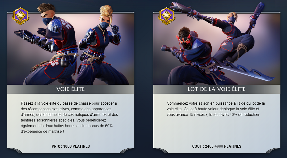 Débloquez le passe de chasse pour 1000 platines ou achetez la version prenium à 2400 platines.