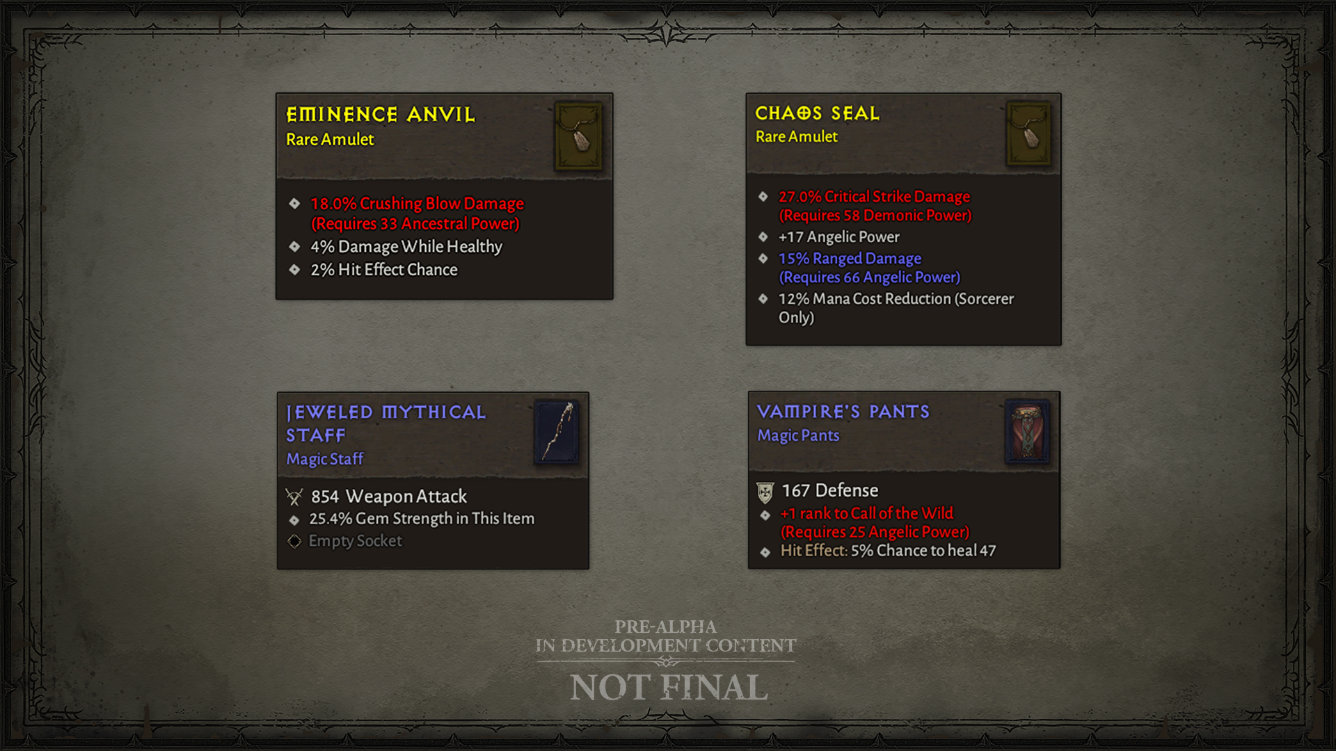 Blizzard n'a pas énormément donné d'informations au sujet des objets dans Diablo 4. Les développeurs ont toutefois pu tester les premiers objets et la progression des personnages pour y apporter les ajustements nécessaires. La firme américaine a annoncé que les objets seront le sujet d'un post plus détaillé plus tard dans l'année. Voici cependant quelques exemples d'objets partagés par les développeurs du jeu.