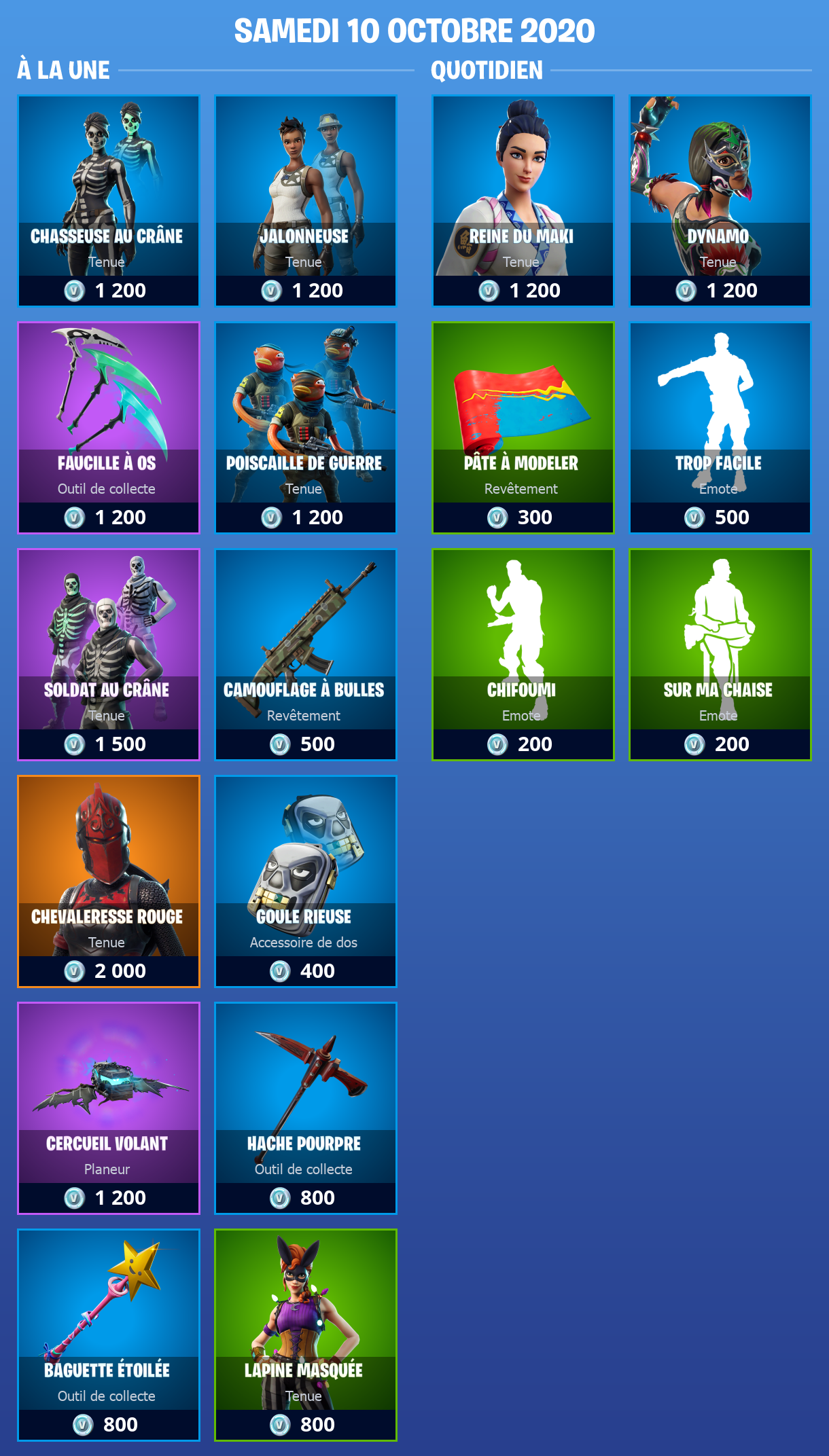 Vous pouvez retrouver dans cette boutique du 10 octobre tout un tas de skins. Faites votre choix car certains skins pourraient ne pas revenir avant plusieurs semaines, mois, années... De nombreux choix de cosmétiques s'offrent à vous !