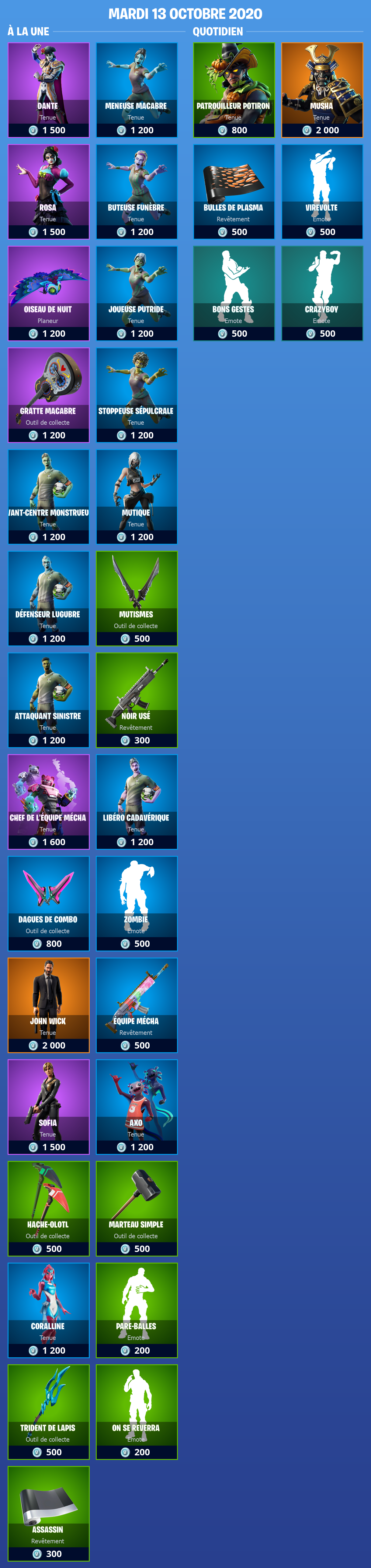 Vous pouvez retrouver dans cette boutique du 13 octobre tout un tas de skins. Faites votre choix car certains skins pourraient ne pas revenir avant plusieurs semaines, mois, années... De nombreux choix de cosmétiques s'offrent à vous !