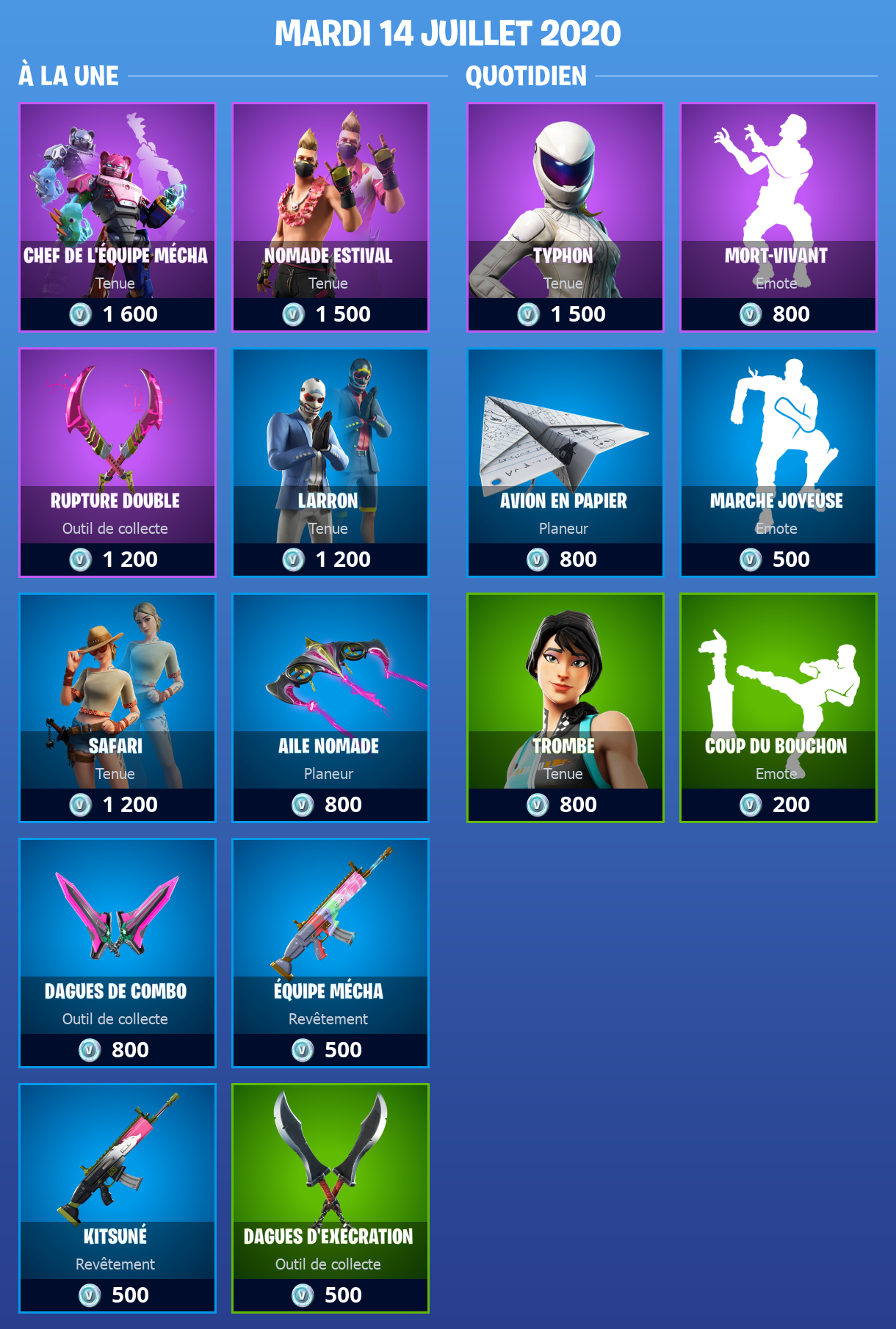 Vous pouvez retrouver dans cette boutique du 14 juillet 2020 tout un tas de skins. Faites votre choix car certains skins pourraient ne pas revenir avant plusieurs semaines, mois, années... De nombreux choix de cosmétiques s'offrent à vous !