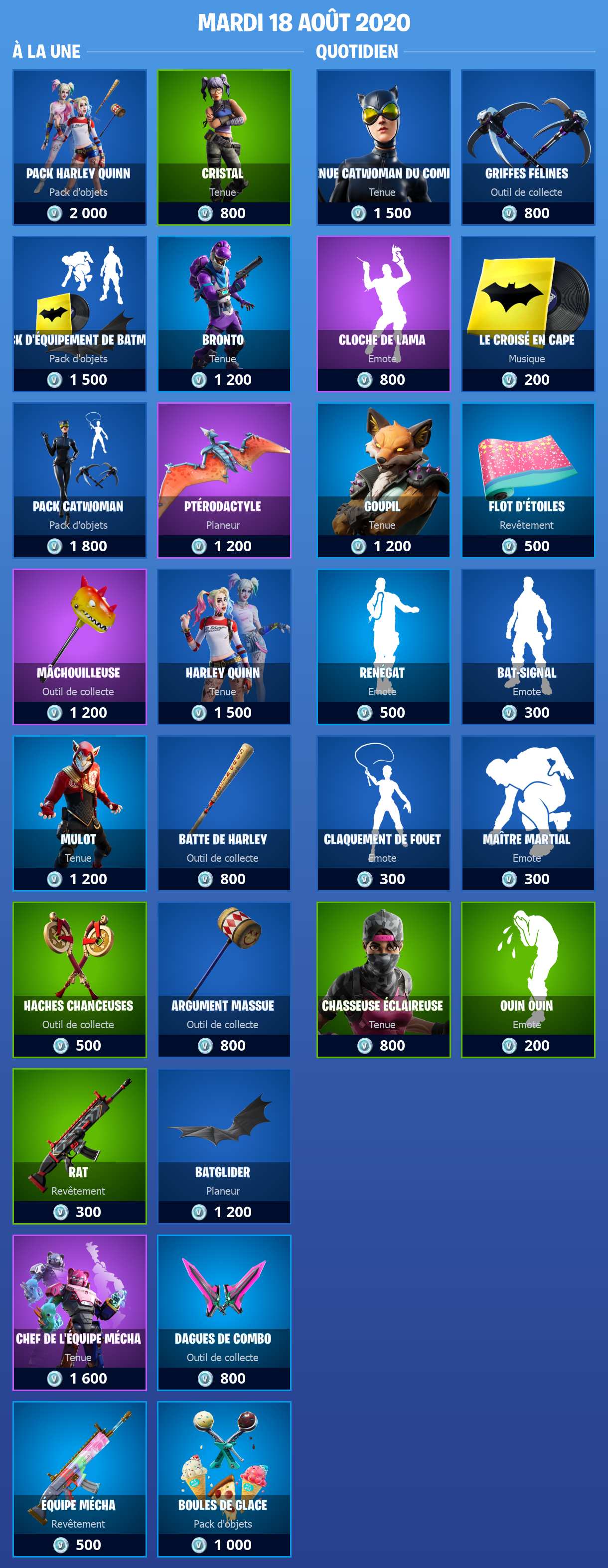 Boutique Fortnite 18 août 2020 avec Harley Quinn, Catwoman et Batman