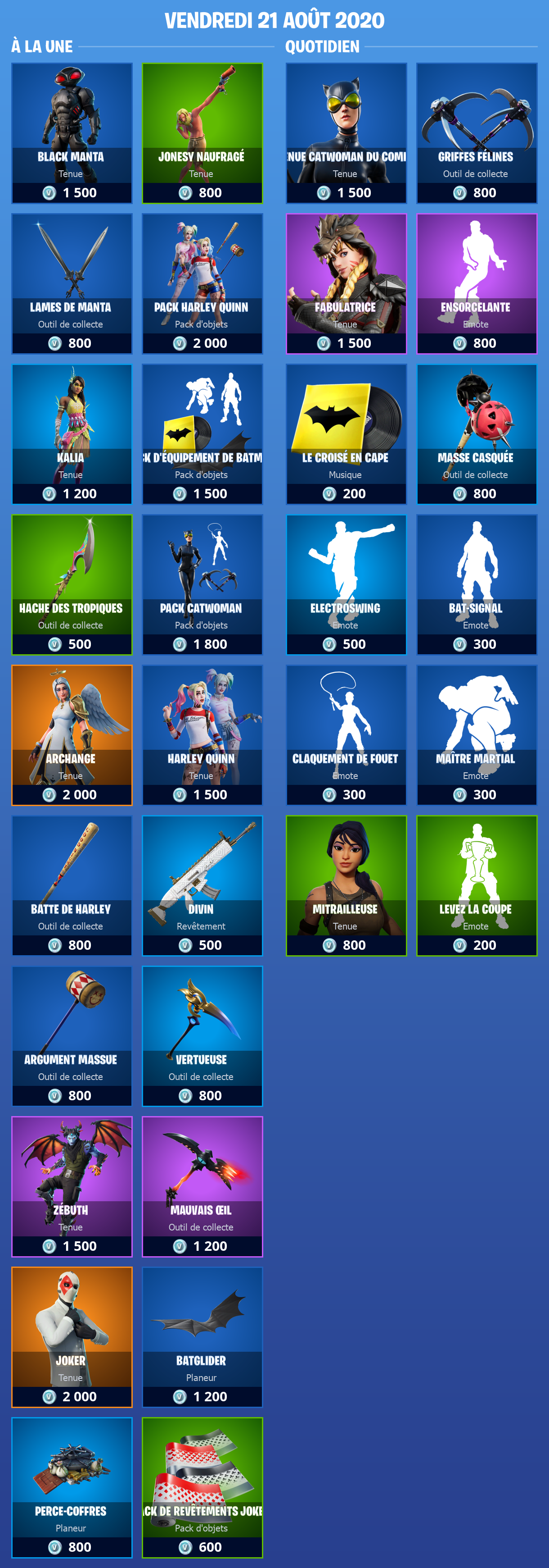 Boutique Fortnite 21 août 2020 avec Harley Quinn, Catwoman et Batman