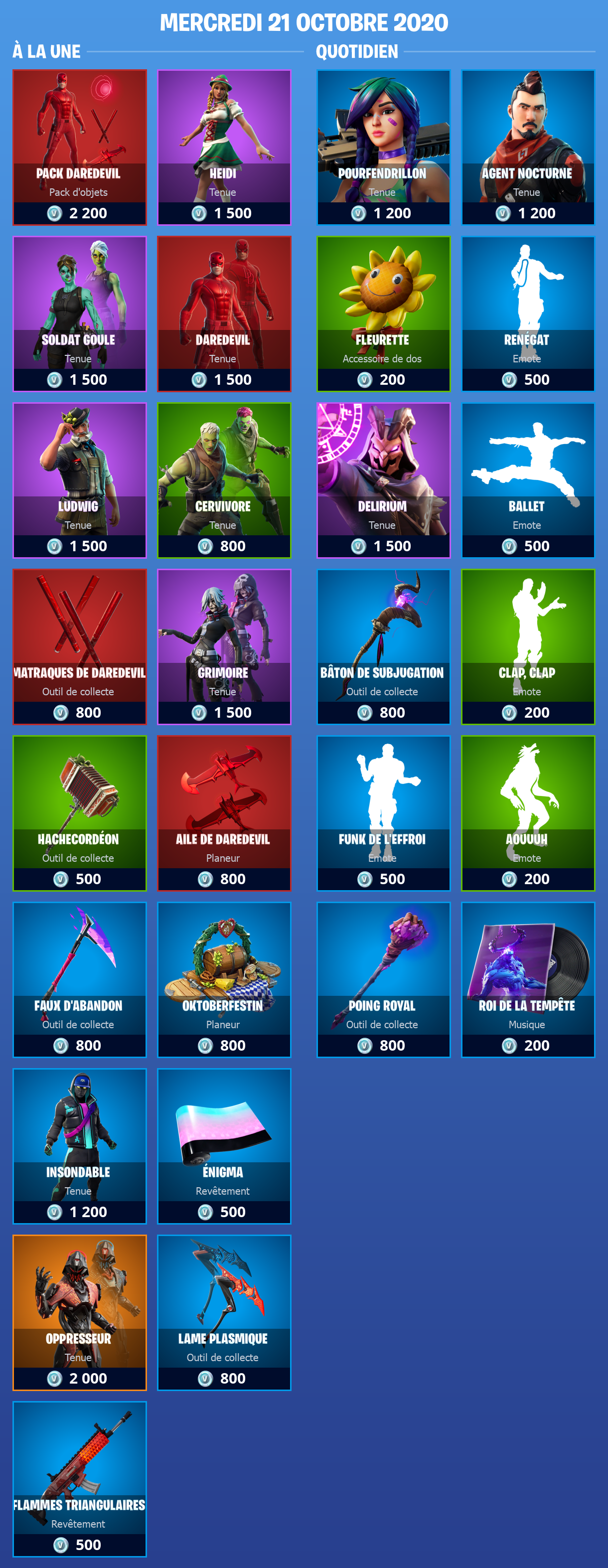 Vous pouvez retrouver dans cette boutique du 21 octobre tout un tas de skins. Faites votre choix car certains skins pourraient ne pas revenir avant plusieurs semaines, mois, années... De nombreux choix de cosmétiques s'offrent à vous !