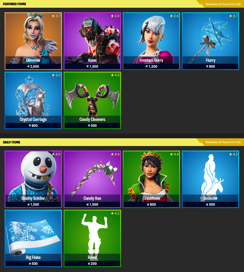 Vous pouvez retrouver dans cette boutique du 23 décembre 2019 tout un tas de skins. Faites votre choix car certains skins pourraient ne pas revenir avant plusieurs semaines, mois, années... De nombreux choix de cosmétiques s'offrent à vous !