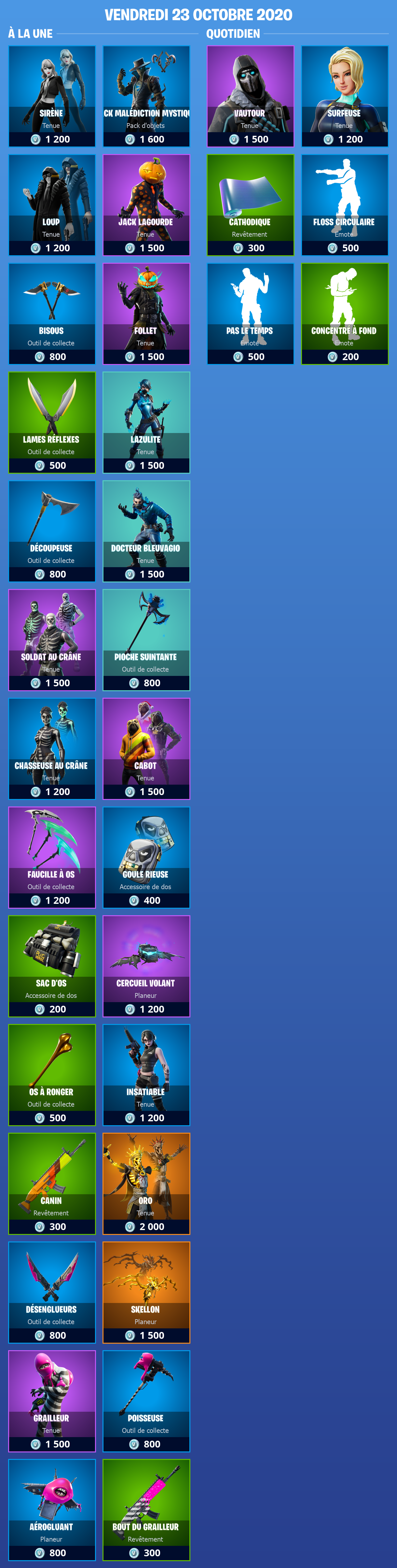 Vous pouvez retrouver dans cette boutique du 24 octobre tout un tas de skins. Faites votre choix car certains skins pourraient ne pas revenir avant plusieurs semaines, mois, années... De nombreux choix de cosmétiques s'offrent à vous !