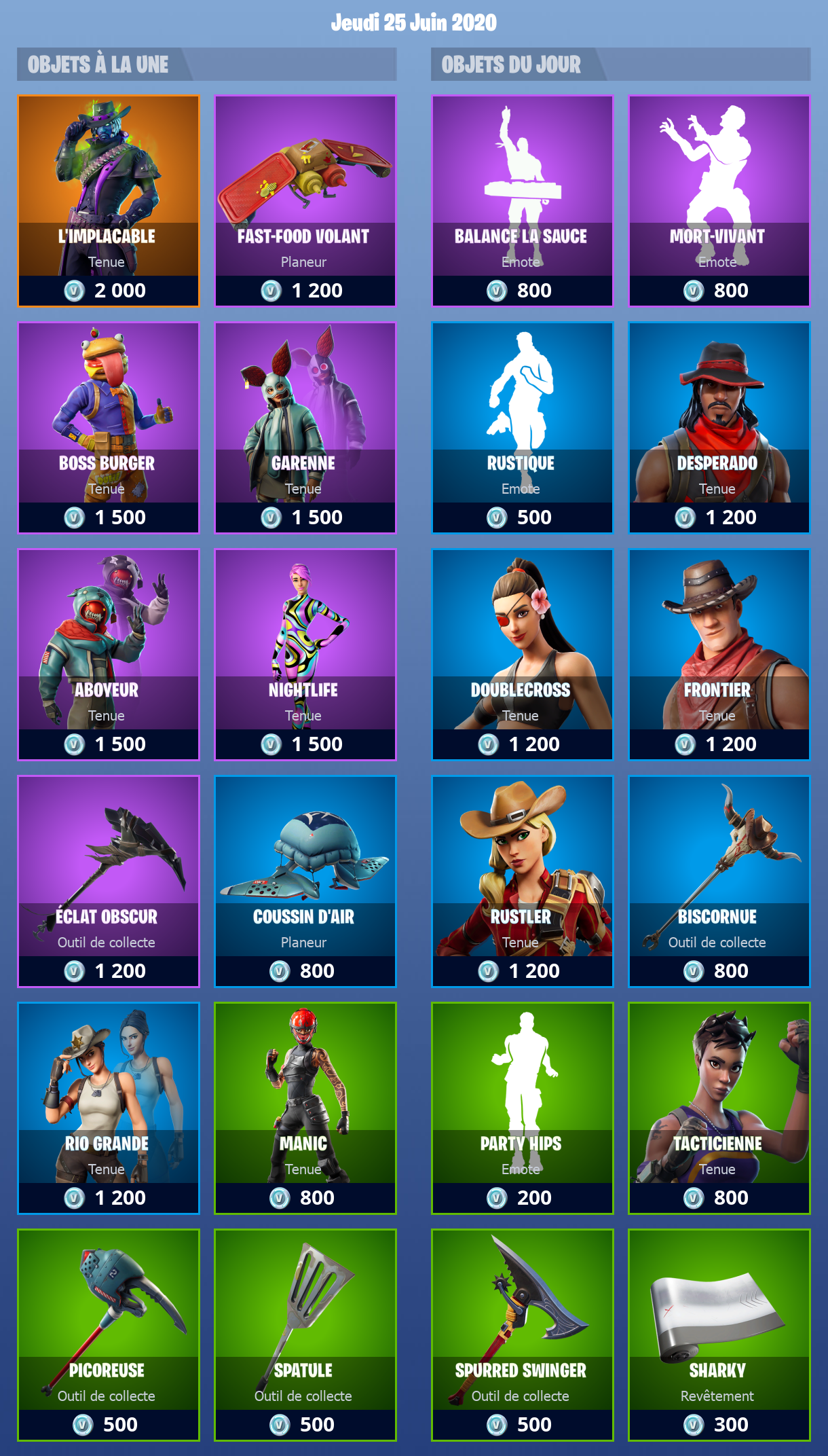 Vous pouvez retrouver dans cette boutique du 25 juin 2020 tout un tas de skins. Faites votre choix car certains skins pourraient ne pas revenir avant plusieurs semaines, mois, années... De nombreux choix de cosmétiques s'offrent à vous !