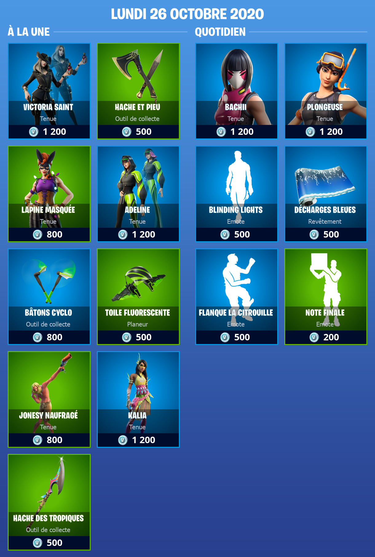 Vous pouvez retrouver dans cette boutique du 26 octobre tout un tas de skins. Faites votre choix car certains skins pourraient ne pas revenir avant plusieurs semaines, mois, années... De nombreux choix de cosmétiques s'offrent à vous !