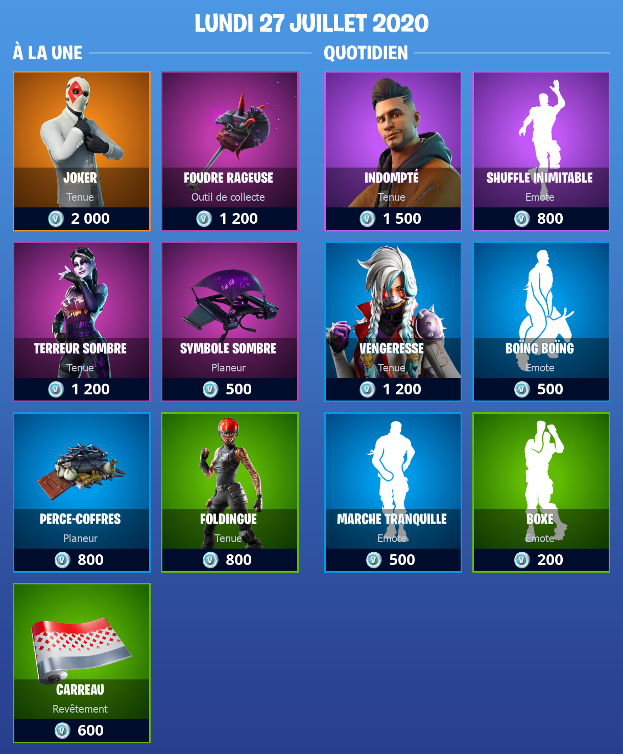 Vous pouvez retrouver dans cette boutique du 27 juillet 2020 tout un tas de skins. Faites votre choix car certains skins pourraient ne pas revenir avant plusieurs semaines, mois, années... De nombreux choix de cosmétiques s'offrent à vous !