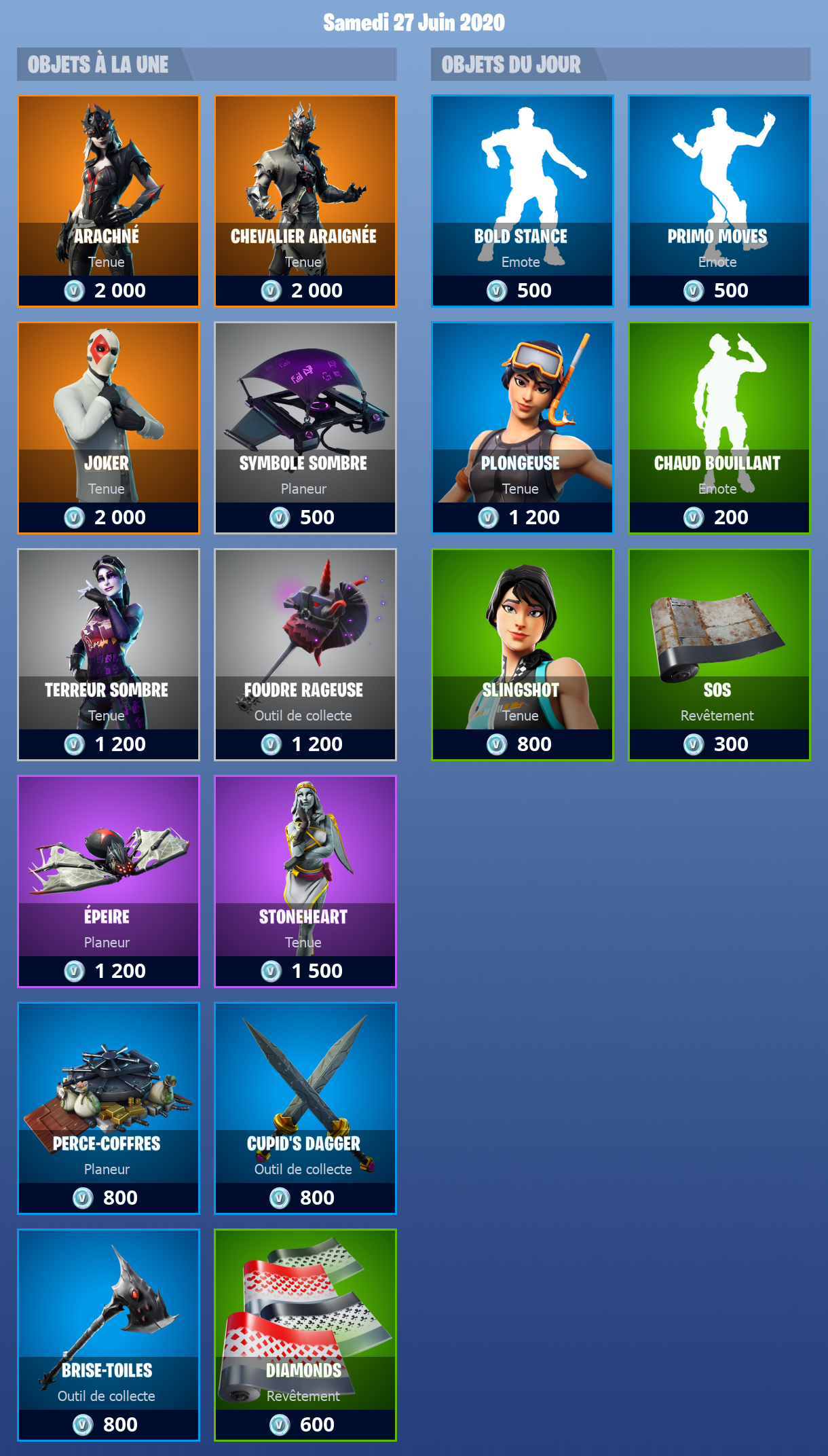 Vous pouvez retrouver dans cette boutique du 27 juin 2020 tout un tas de skins. Faites votre choix car certains skins pourraient ne pas revenir avant plusieurs semaines, mois, années... De nombreux choix de cosmétiques s'offrent à vous !