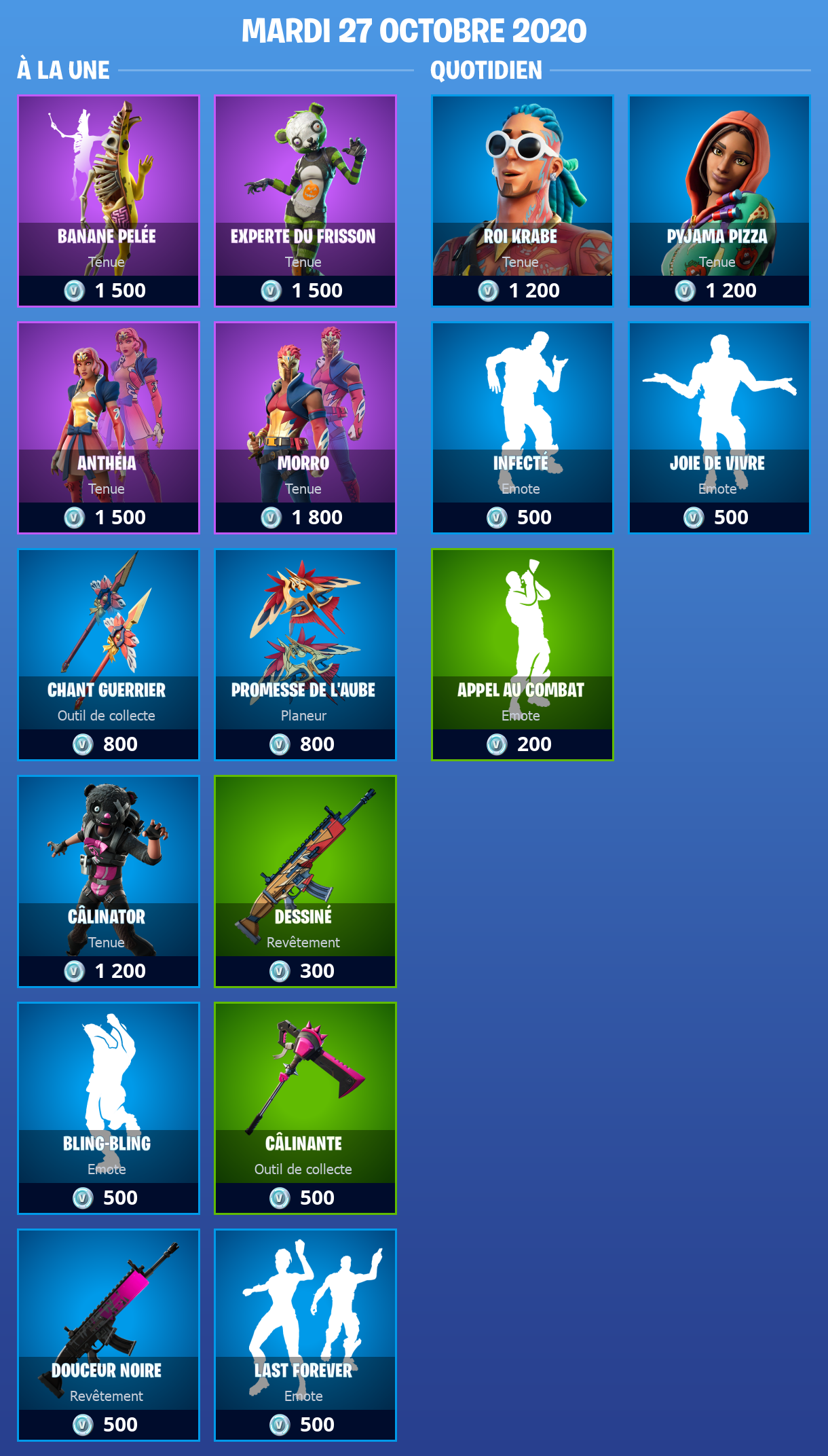 Vous pouvez retrouver dans cette boutique du 27 octobre tout un tas de skins. Faites votre choix car certains skins pourraient ne pas revenir avant plusieurs semaines, mois, années... De nombreux choix de cosmétiques s'offrent à vous !