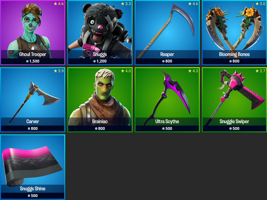 Vous pouvez retrouver dans cette boutique du 31 octobre 2019 tout un tas de skins. Faites votre choix car certains skins pourraient ne pas revenir avant plusieurs semaines, mois, années... De nombreux choix de cosmétiques s'offrent à vous !