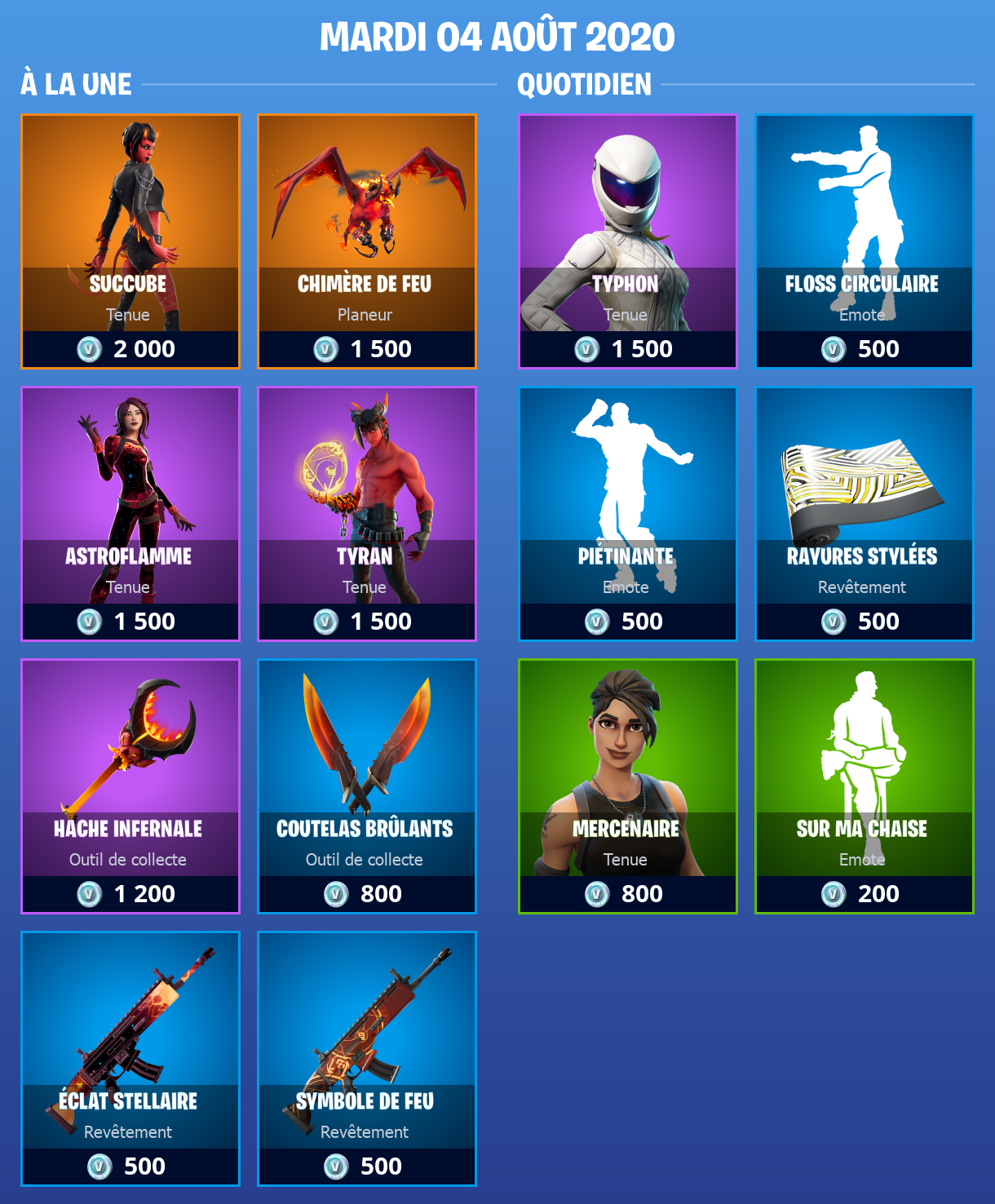 Vous pouvez retrouver dans cette boutique du 4 août tout un tas de skins. Faites votre choix car certains skins pourraient ne pas revenir avant plusieurs semaines, mois, années... De nombreux choix de cosmétiques s'offrent à vous !
