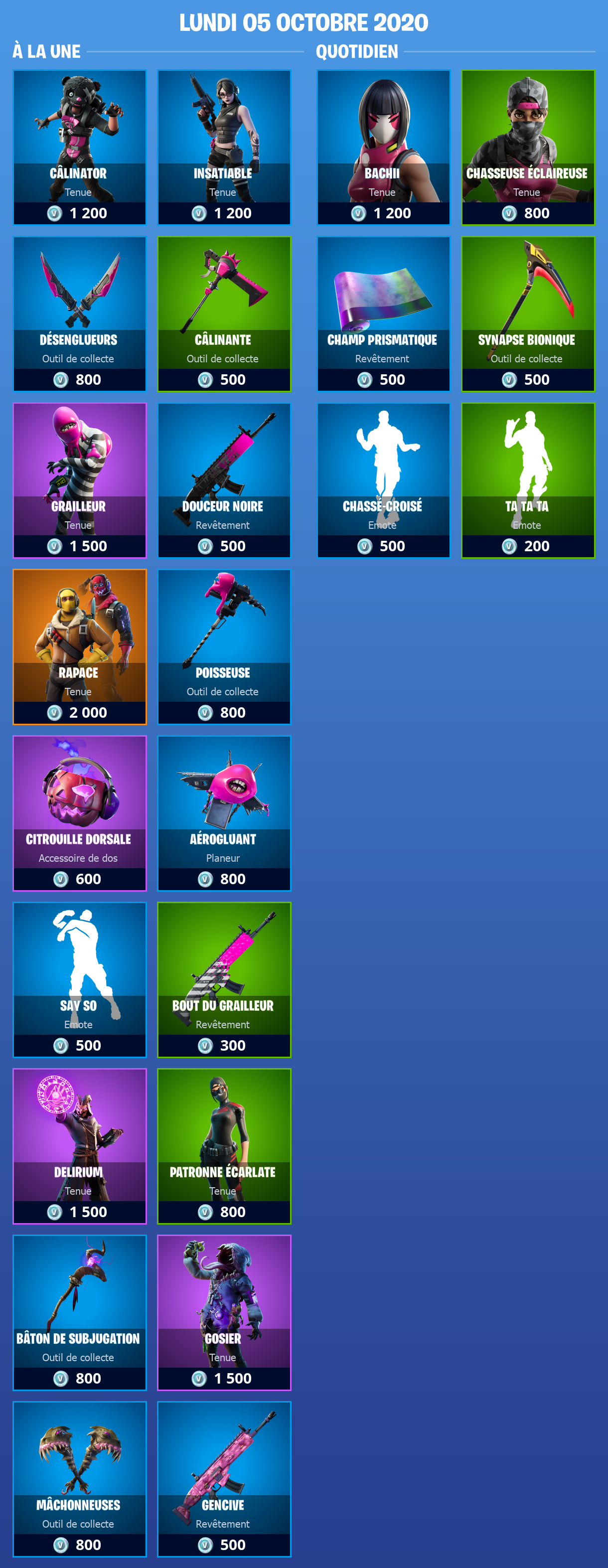 Vous pouvez retrouver dans cette boutique du 5 octobre tout un tas de skins. Faites votre choix car certains skins pourraient ne pas revenir avant plusieurs semaines, mois, années... De nombreux choix de cosmétiques s'offrent à vous !
