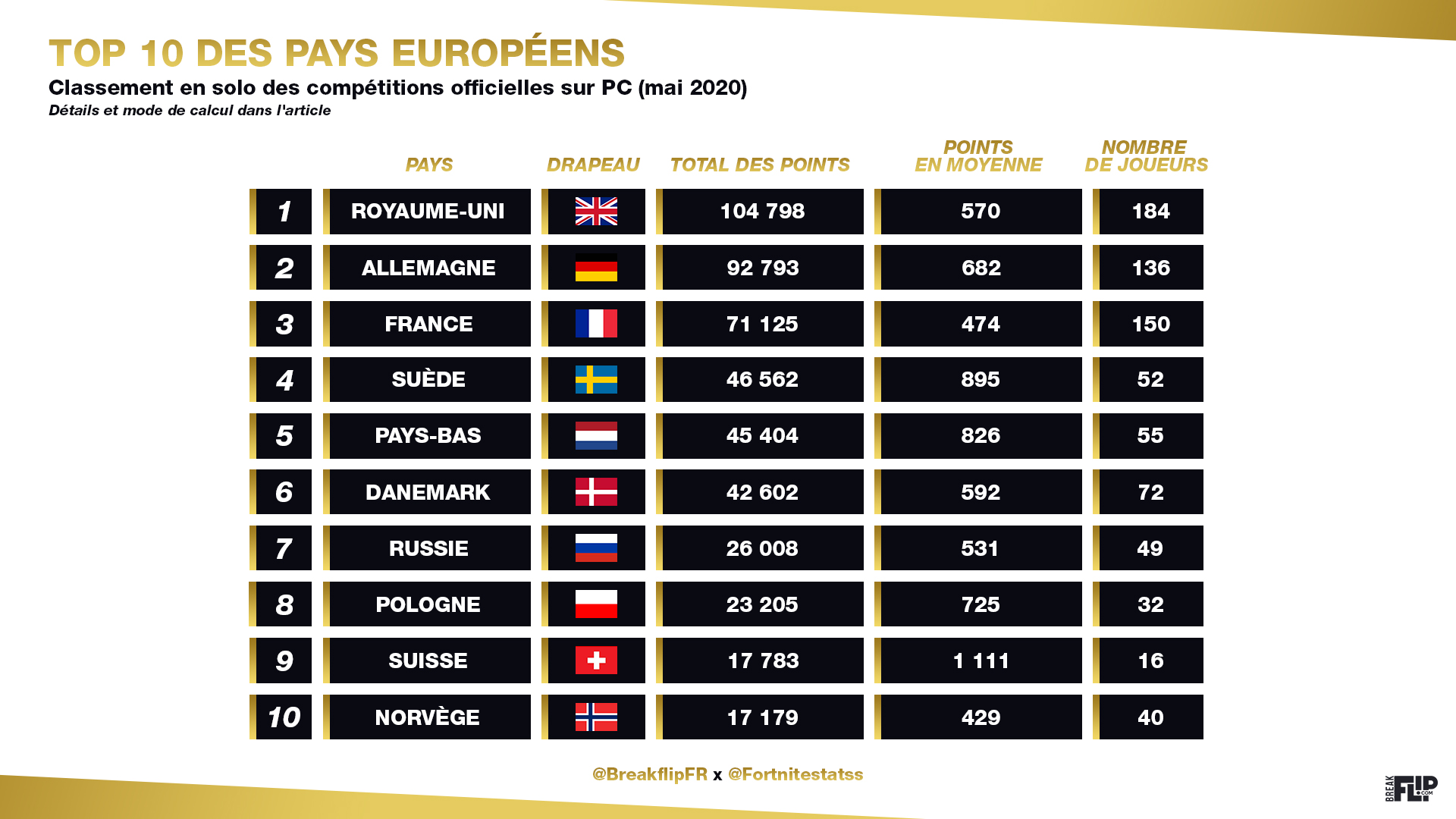 Classement Fortnite des meilleurs pays en mai 2020