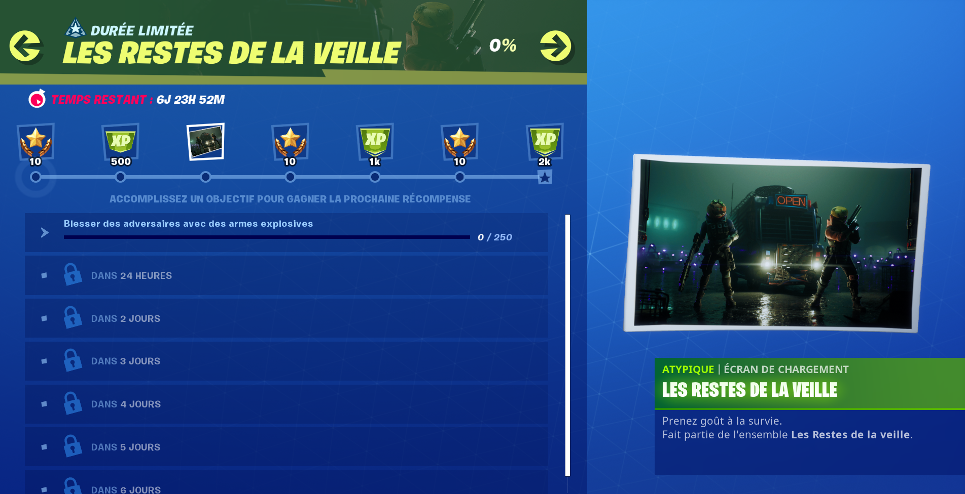 Les missions Les Restes de la veilles sont disponibles jusqu'à jeudi prochain et sont révélées tous les jours à 15h. Une fois, les défis validés, il sera possible de collecter l'étoile cachée dans l'écran de chargement.