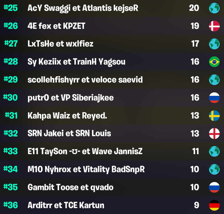 - Chaque weekend, les autres joueurs marquent des points. Les 120 meilleures duos non-qualifiées avec le plus de points à l'issue des 4 week-ends seront qualifiés pour la grande finale