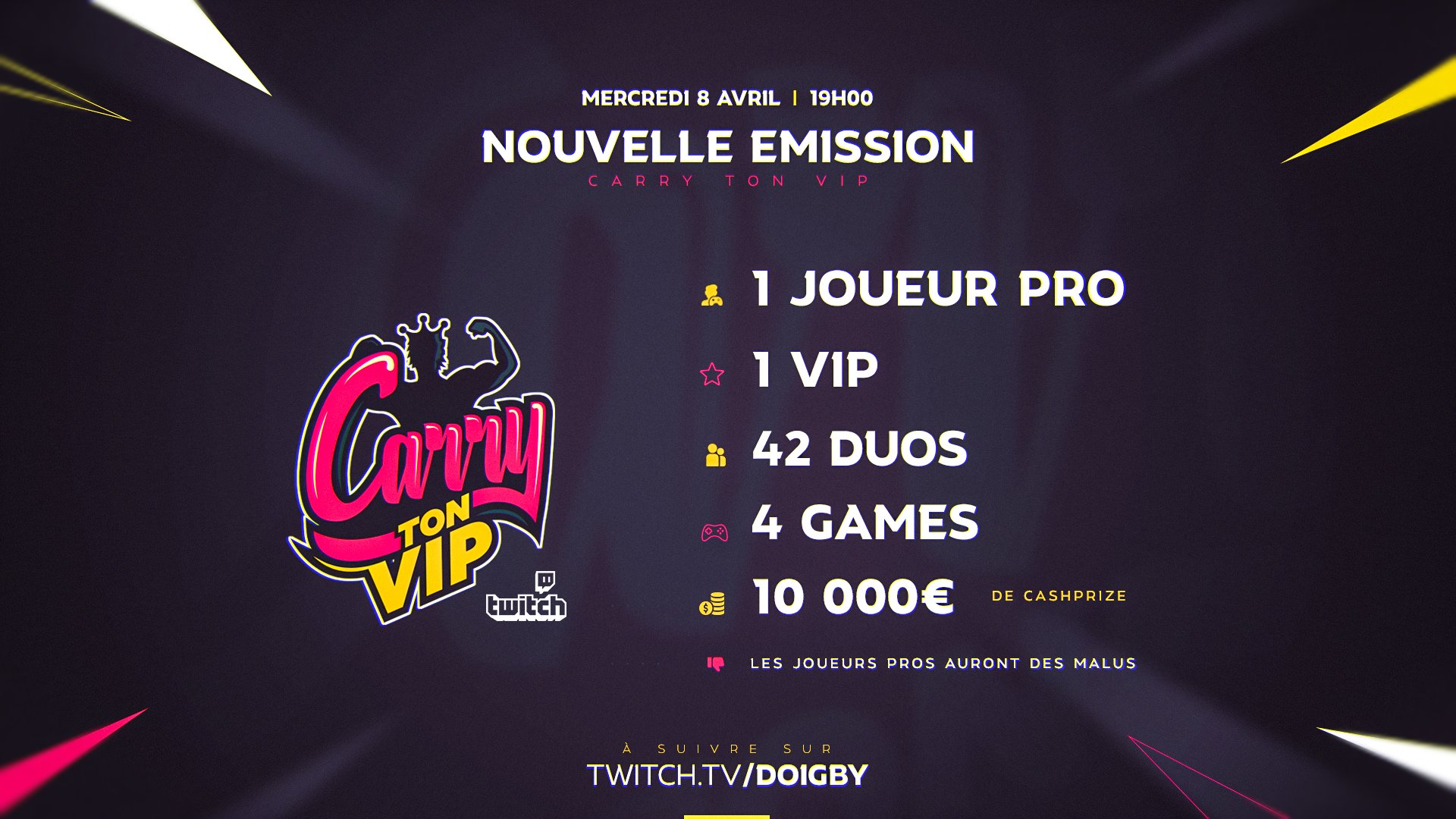 Après Boxfight Warriors, la DOIGCUP ou encore le Masterbuild, Doigby revient avec un tout nouveau projet d'émission : CarryTonVIP ! Il s'agit d'un tournoi mêlant joueurs professionnels et amateurs, réunis le temps d'une soirée pour s'affronter sur Fortnite et se partager un cashprize.