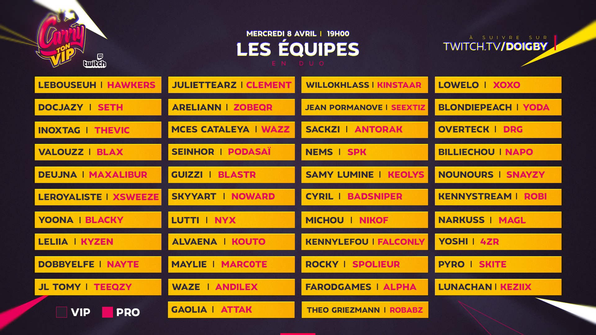 Ce dimanche, Doigby a annoncé sur ses réseaux sociaux le lancement d'une nouvelle émission : CarryTonVIP ! Le principe est simple, 42 duos vont s'affronter sur Fortnite au cours de 4 parties, et vont pouvoir se partager un cashprize à la fin. Les duos seront tous constitués d'un joueur professionnel et d'un VIP (créateur de contenu), un peu à l'image des Pro-AM organisés par Epic Games.