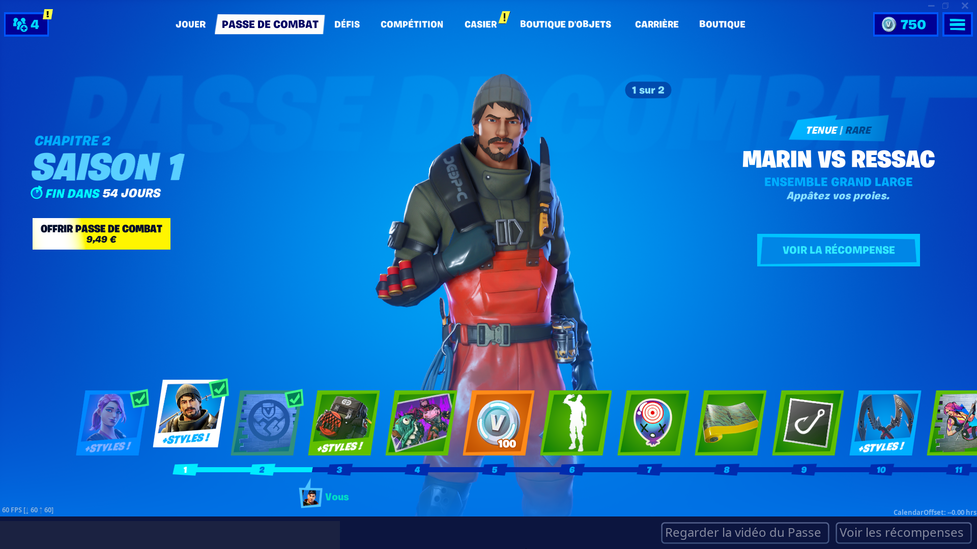 Si vous souhaitez acheter un passe de combat, il vous faudra dépenser 950 VBucks dans le jeu, soit environ 10 €. L'achat du passe de combat vous offre automatiquement 2 skins : Apogée vs intrépide et Marin vs Ressac.