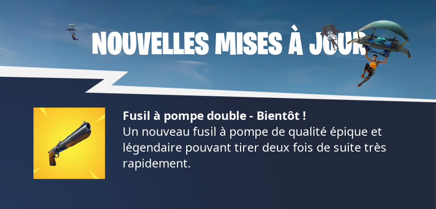 Avec la mise à jour 5.20 de mardi 7 août, Epic Games a implanté une nouvelle arme dans Fortnite. Il s'agit d'un Fusil à pompe double, qui peut tirer deux fois de suite très rapidement. Cela rappelle bien évidemment la méta « double pompe » où les joueurs s'équipaient de deux fusils à pompe.
