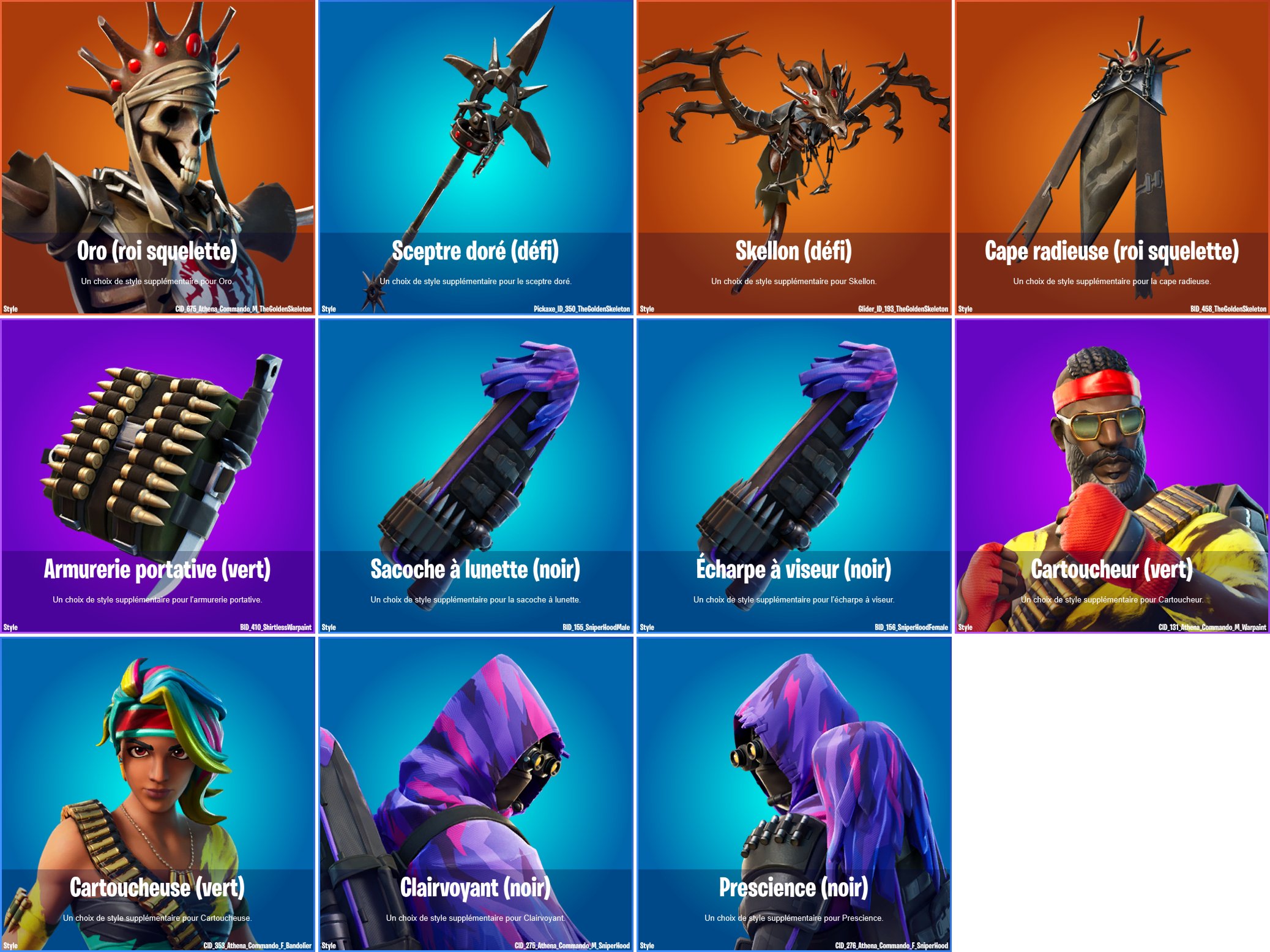 On ne sait pas quand tous ces skins sortiront mais il y a de grandes chances pour que la majorité arrive dans les dix prochains jours. Veillez au grain et pensez à regarder la boutique du jour sur Fortnite ! En attendant, voilà les skins et leurs accessoires trouvés dans les fichiers du jeu.
