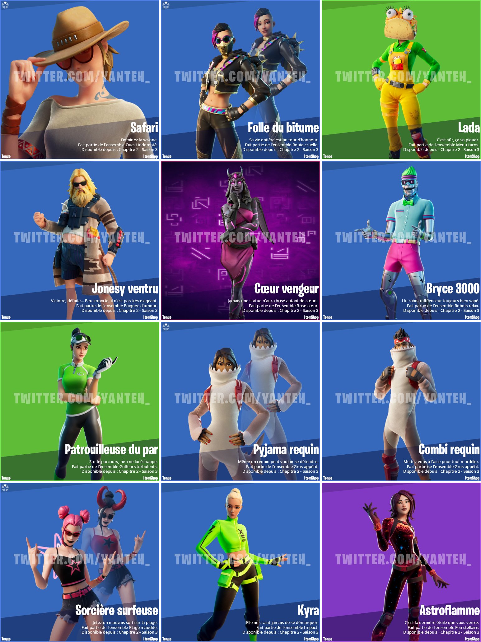 On ne sait pas quand tous ces skins sortiront mais il y a de grandes chances pour que la majorité arrive dans les dix prochains jours. Veillez au grain et pensez à regarder la boutique du jour sur Fortnite ! En attendant, voilà les skins et leurs accessoires trouvés dans les fichiers du jeu.