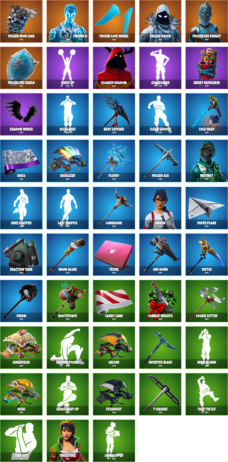 Nouvelle mise à jour, donc nouveaux skins trouvés dans les fichiers du jeu Fortnite ! Au programme, des skins de glace, des skins pour Noël et bien évidemment, une multitude de parachutes et accessoires de dos, sans oublier les emotes !