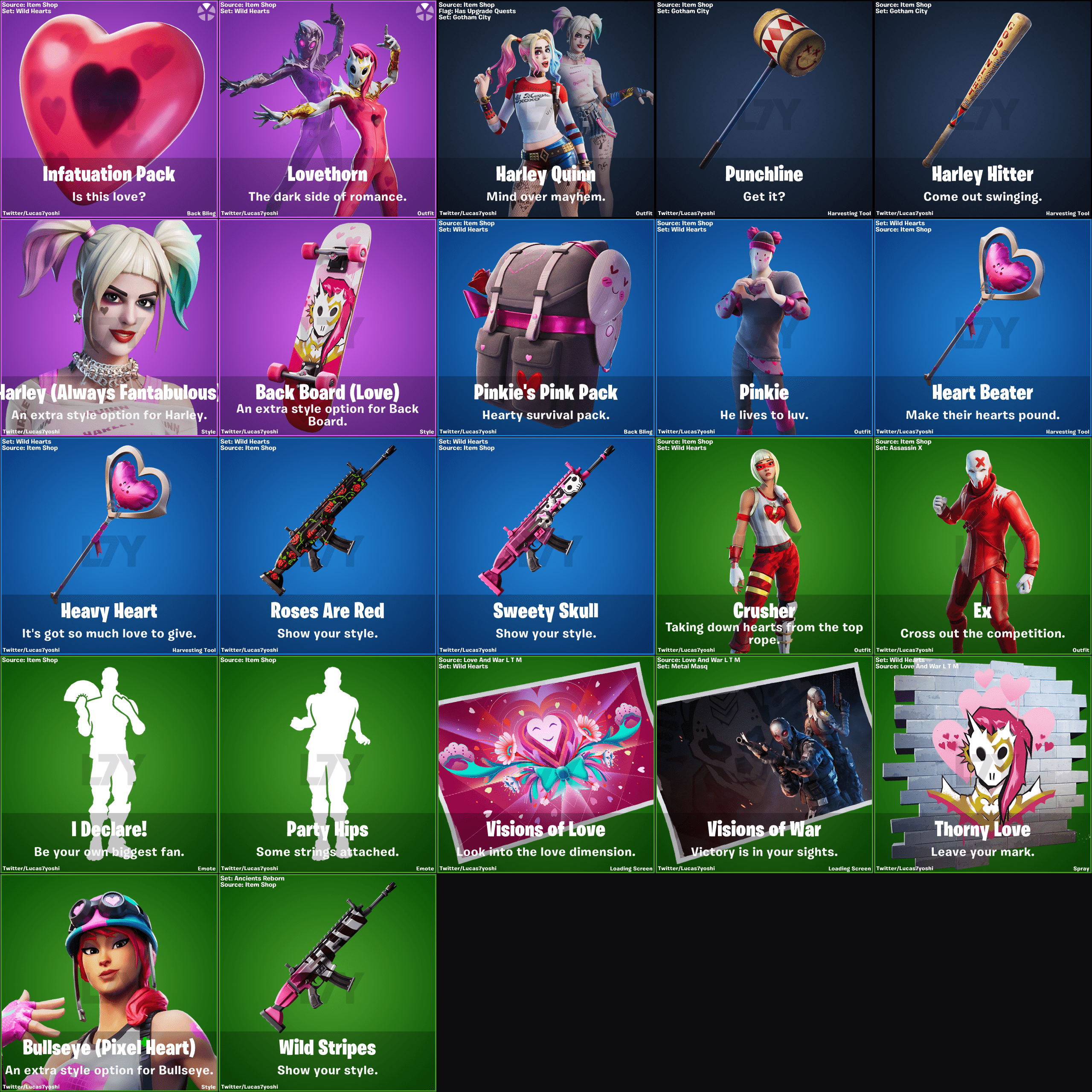 La St-Valentin a lieu le 14 février, quelques jours avant la fin de la Saison 1, il est donc logique que des skins soient dans cette mise à jour. Voici la liste des skins trouvés jusqu'à présent dans les fichiers du jeu :