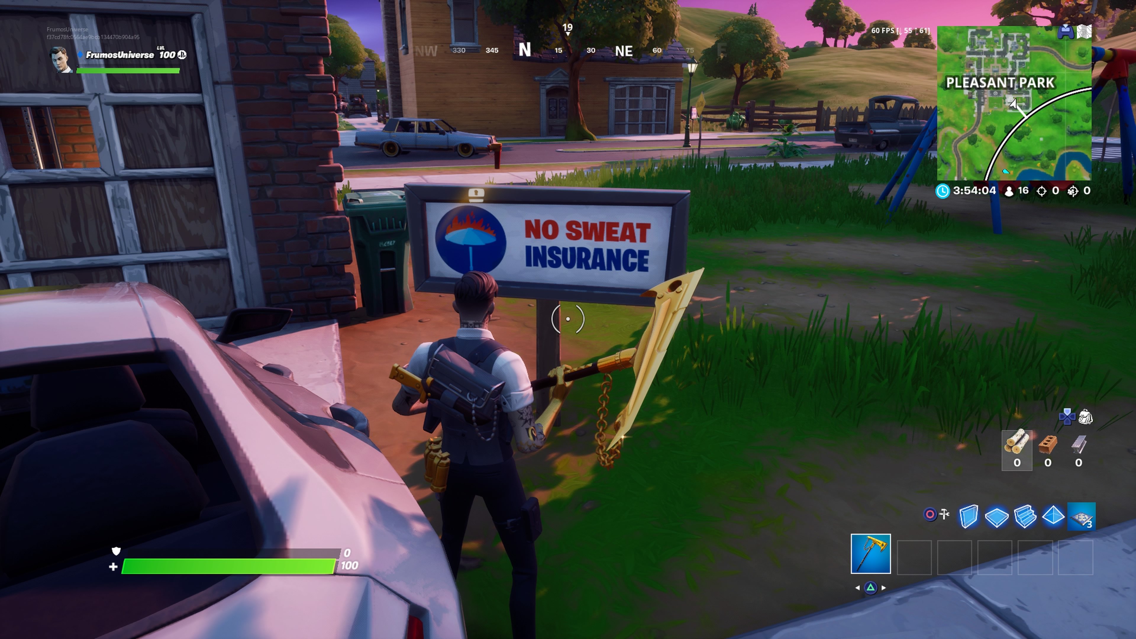 La maintenance de la mise à jour 12.40 est désormais terminée, et plusieurs changements ont eu lieu sur la carte de Fortnite ! L'un d'eux concerne un étrange panneau qui vient de faire son apparition en plein coeur de Pleasant Park. Sur ce panneau se trouve un logo et un nom « No Sweat Insurance ». Il s'agit du panneau d'une compagnie d'assurance, qui se situait auparavant à Tilted Towers.