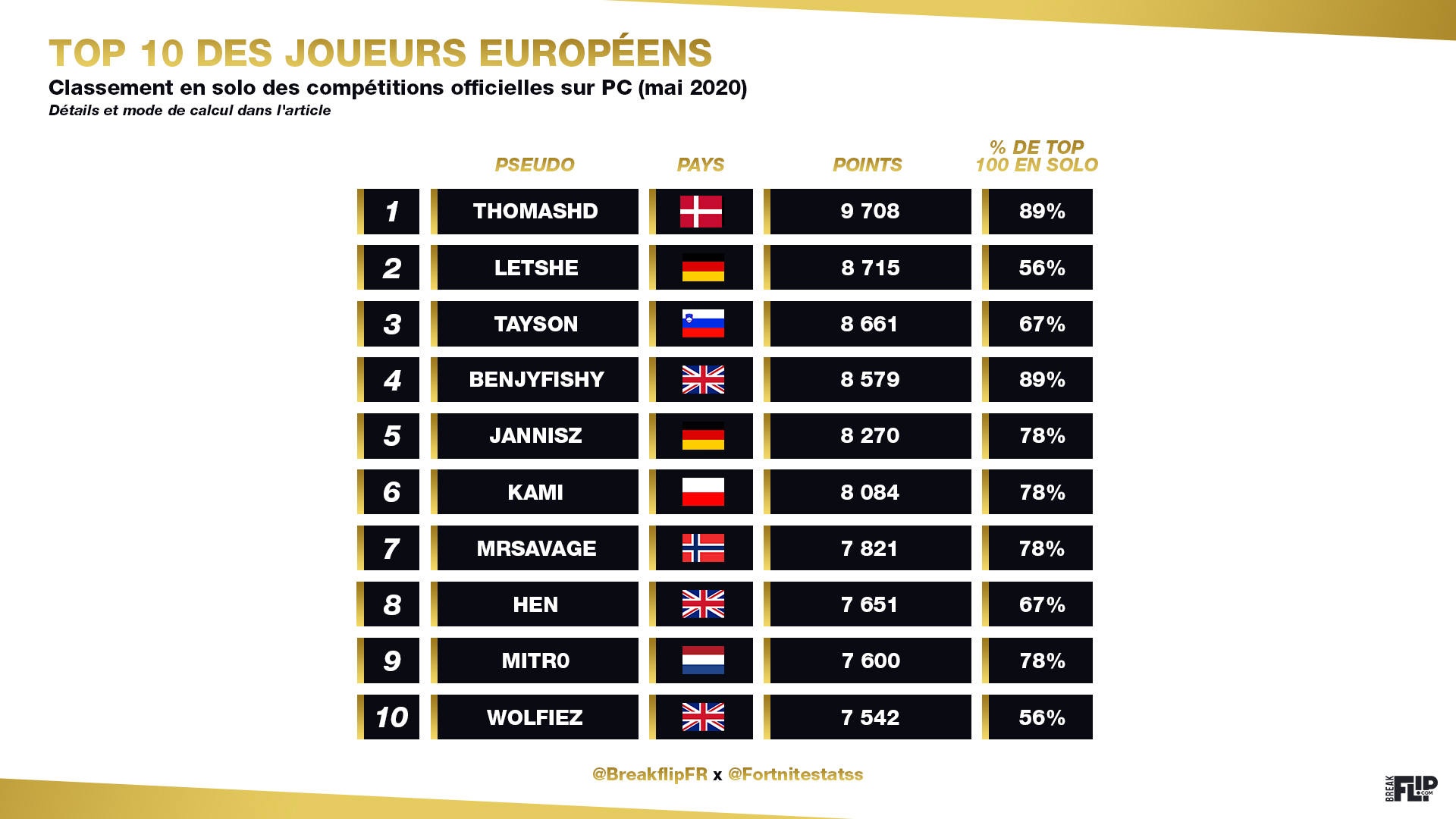 Vous vous êtes toujours demandé quels étaient les meilleurs joueurs du moment sur Fortnite ? Nous aussi. C'est pour cela qu'avec Fortnitestatss, nous avons décidé de vous proposer chaque mois un classement des joueurs en fonction de leur nationalité ou de leur structure. Ce classement est basé uniquement sur les tournois officiels Epic Games du mois de mai 2020 sur PC et en solo (Cash Cup, Benjyfishy Cup et FNCS).