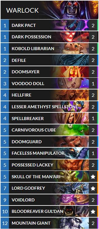 Avec seulement cinq sorts dans le deck, il est impératif de garder les Livre des spectres ainsi que les Intelligences des arcanes. Avoir l'Archimage Arugal peut aussi être une option viable pour rentabiliser vos serviteurs. Les Auspices funestes seront nécessaires pour gérer les decks Aggro. |