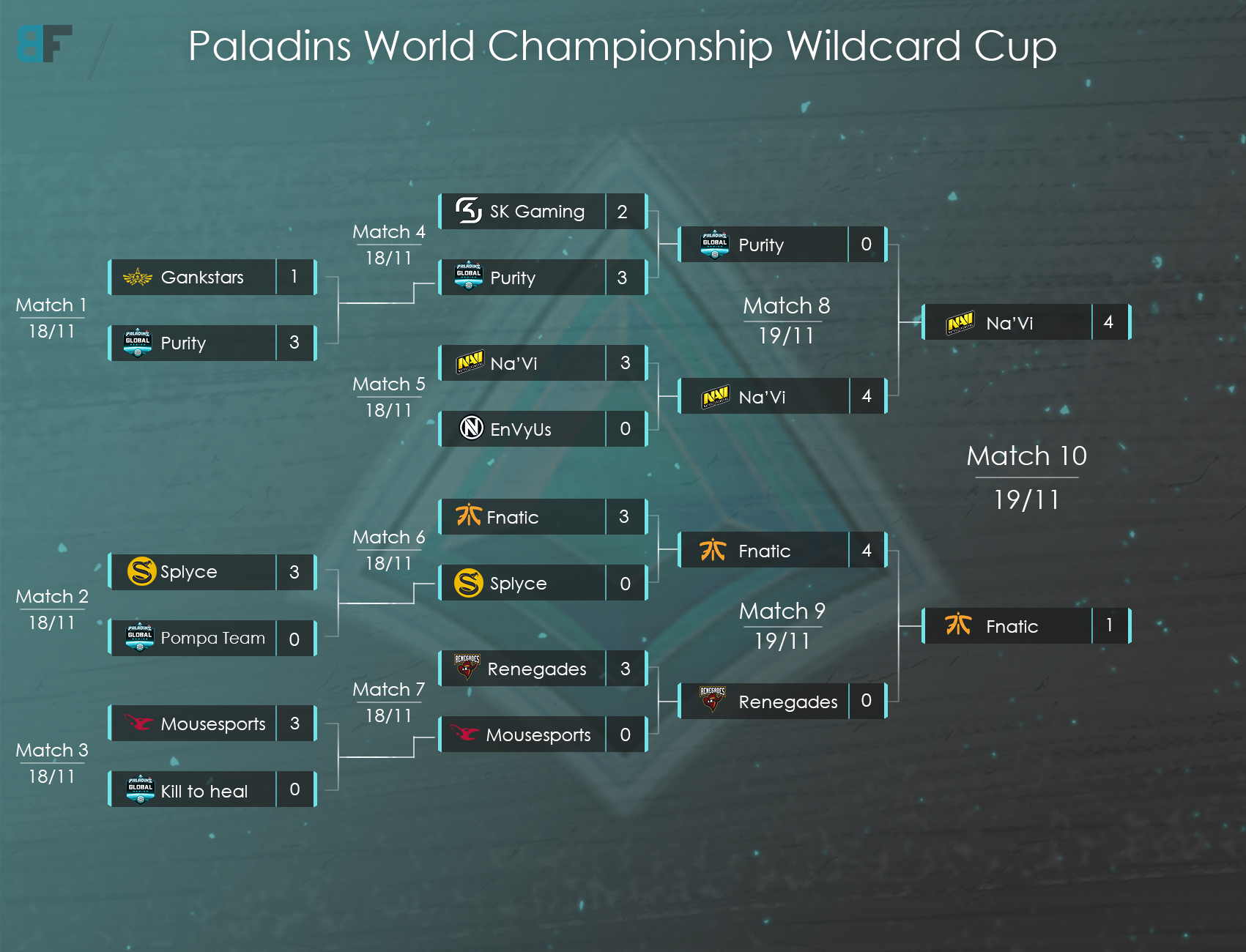 Afin de se qualifier au World Championship de Paladins, les Européens et les Américains se sont donnés rendez-vous cette semaine. Alors que du jeudi 16 au vendredi 17 novembre on pourra retrouver les PPL Fall Finals, le week-end sera également chargé ! En effet, les deux jours restants seront réservés à la Wildcard Cup. La compétition sera composée des 7 équipes de PPL non-qualifiées aux Worlds ainsi que les 2 meilleures équipes des Paladins Global Series EU & NA ; 11 équipes s'opposeront dans le bracket pour deux places aux Worlds avec un seed de Wildcard (les gagnants des demi-finales)