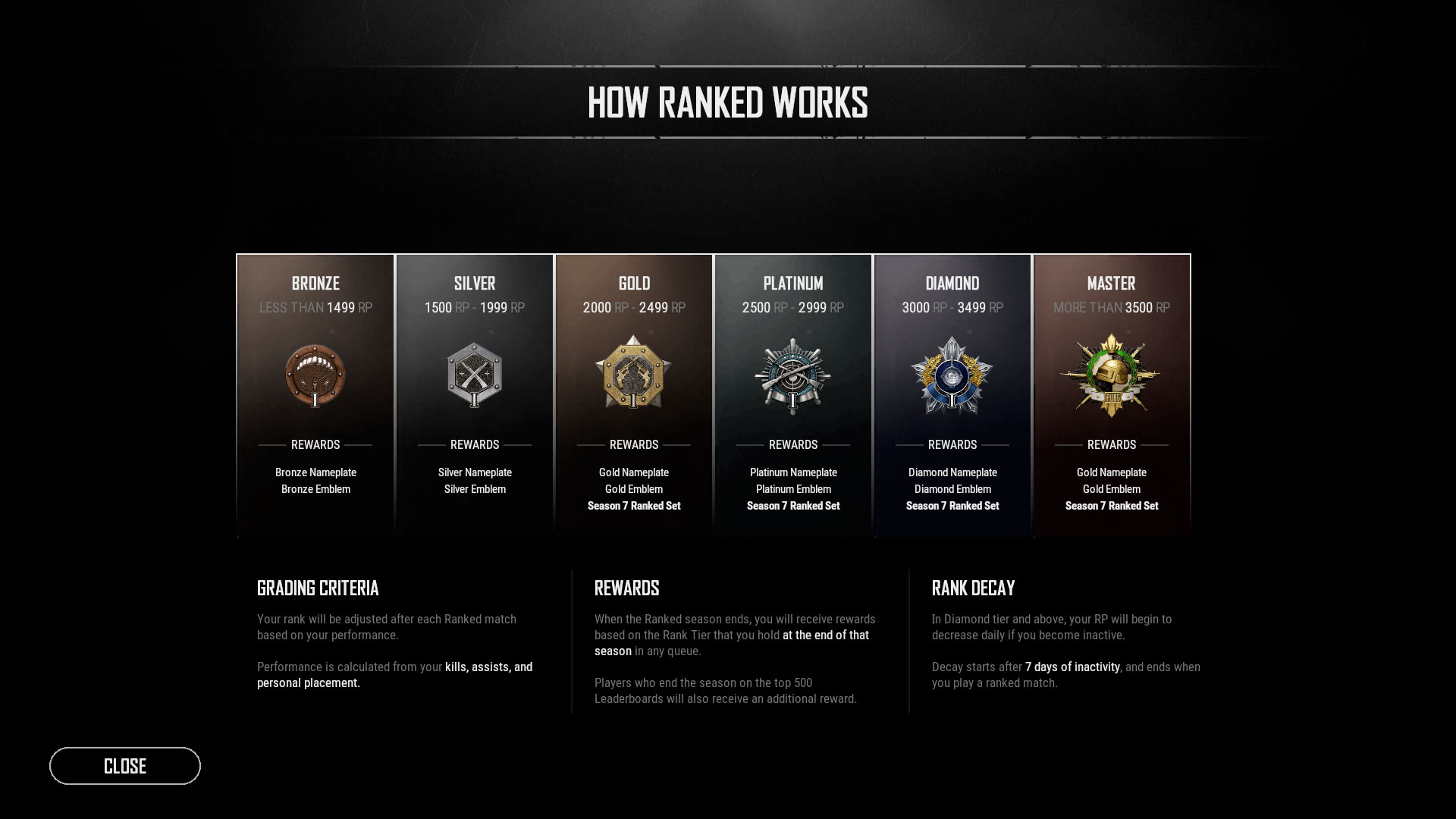 Mais qui dit mode compétitif dit aussi classement. Pour cela PUBG a dévoilé les différentes divisions qui forment le ladder des parties classées. Pour atteindre le plus haut rang les joueurs doivent tout d'abord disputer cinq parties de placement. Une fois ces parties terminées les joueurs intégreront une division en fonction de leurs résultats. Des points, ou RP, seront attribués en fonction des éliminations, assistances et placement des joueurs au cours d'une partie. Cela leur permettra de franchir les divisions, elles-mêmes divisées en cinq étapes. Une fois le rang Diamant atteint il faudra continuer de jouer régulièrement pour ne pas descendre dans le classement. Quand la saison sera terminée, les joueurs recevront des récompenses exclusives en fonction de leur rang.