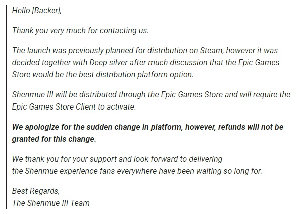 Shenmue 3 : Polémique après l'annonce de l'exclusivité du jeu sur l'Epic Games Store