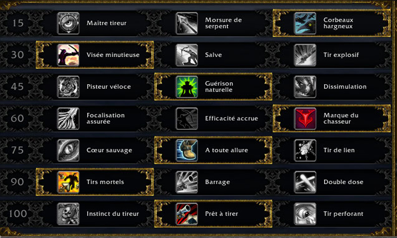 Mono-cible : Marque du chasseur > Visée > Précision > Tir des arcanes > Visée > Visée > Tir rapide > Corbeaux hargneux > Visée > Tir assuré > Tir des arcanes