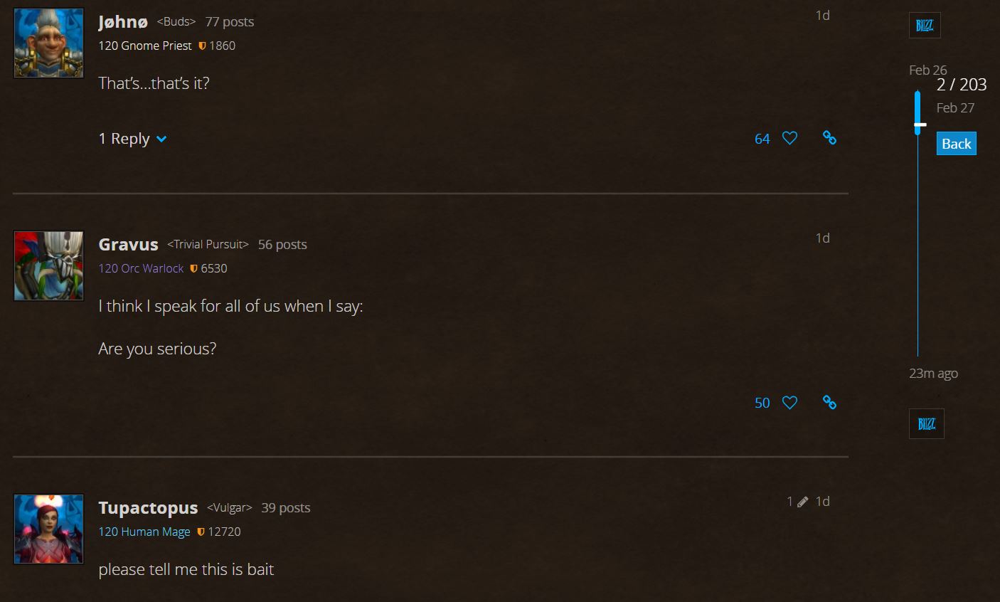 Les joueurs PvP sont dans l'ensemble assez déçus des changements proposés par Blizzard et manifestent régulièrement sur Twitter ou les forums du jeu leur sentiment de ne pas être écoutés. Il ne reste donc plus qu'à espérer que les créateurs de World of Warcraft mettent en place des solution efficaces pour remédier à ces problèmes.