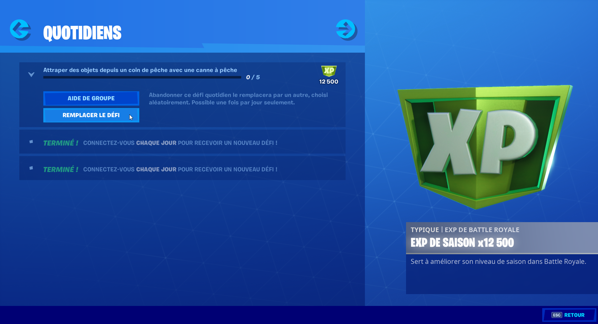 Parmi ces trois défis, il y en a peut-être que ne vous satisfairont pas. Pas de panique, Epic Games a tout prévu ! Chaque jour, vous pouvez échanger le défi de votre choix contre un autre défi aléatoire. Attention, cette option n'est disponible qu'une fois par jour, alors choisissez bien le défi quotidien que vous souhaitez échanger !