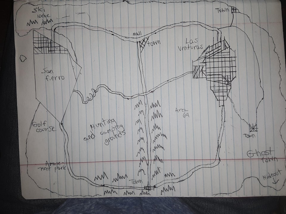 Selon les informations données par l'utilisateur l'aventure se déroulerait dans deux villes principales, San Fierro et Las Venturas, qui seront des zones urbaines d'une carte quatre fois plus grande que celle de GTA V. On retrouverait alors des éléments classiques d'une carte de Gran Theft Auto comme les postes de police, les stations services, le parc d'attraction et le retour de certains éléments uniques comme la Zone 51 ou le barrage. Un zoo et un centre commercial seraient également de la partie. L'utilisateur a ainsi dessiné « de mémoire », selon ses dires, une esquisse de cette nouvelle carte.