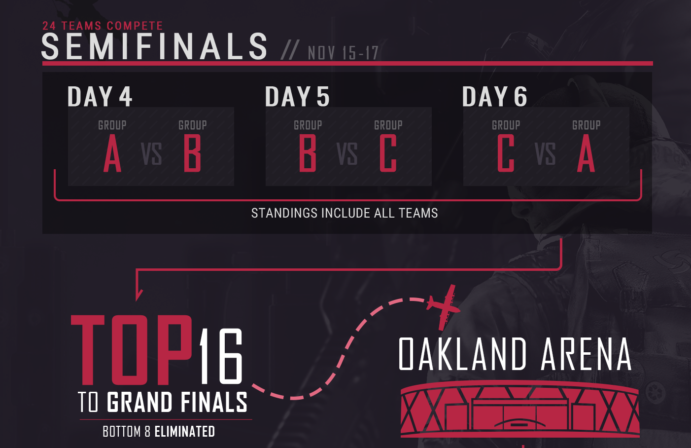 Ces demi-finales se dérouleront du 15 au 17 novembre et verront les équipes qualifiées s'affronter pour gagner leur place dans le top 16 qui participera à la grande finale les 23 et 24 novembre à l'Oakland Arena en Californie.