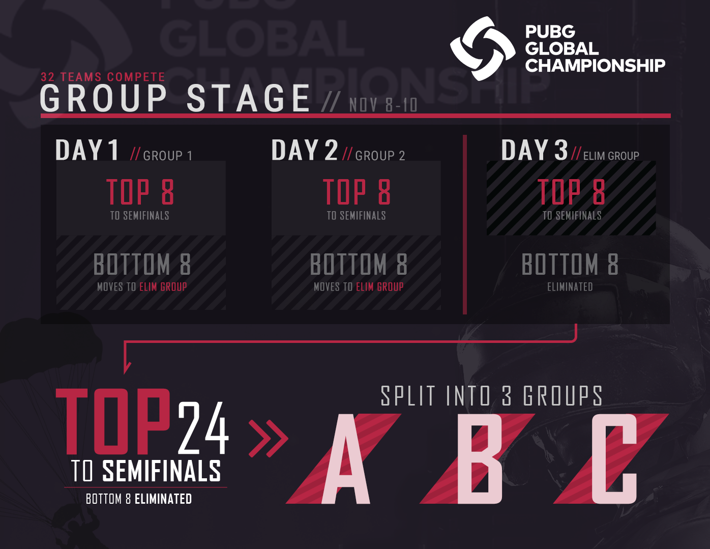 La compétition se déroulera en trois phases chaque week-end de novembre, jusqu'à la grande finale du PGC le dimanche 24 novembre. Une première phase sur trois jours, du 8 au 11 novembre, permettra de désigner les 24 équipes qui participeront aux demi-finales.
