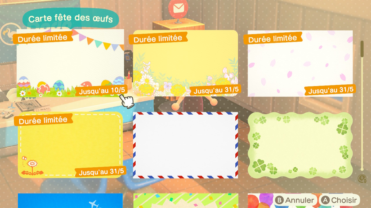 À droite du guichet se trouve un présentoir rempli de cartes postales. C'est à cet endroit que vous pourrez envoyer vos lettres, en sélectionnant d'abord le destinataire, puis le papier à lettres. Vous écrirez ensuite votre message, et si le destinataire est un résident, la lettre sera envoyée immédiatement, pour la somme de 200 clochettes. Vous pouvez également l'envoyer à votre vous du futur, et choisir à quelle date la lettre sera reçue exactement !