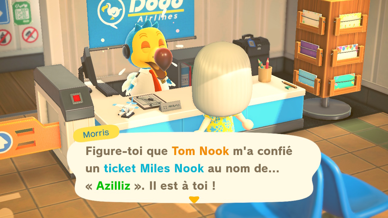 Après le remboursement de votre premier emprunt, Tom Nook vous offrira un Ticket Miles Nook, que vous pourrez utiliser à l'Aéroport pour faire une excursion sur une île déserte ! Partir sur cette île vous permettra entre autre de récolter de nouvelles ressources, d'avoir de nouveaux fruits et de rencontrer de nouveaux habitants. Une fois votre Ticket utilisé, il n'est plus valable, mais vous pourrez en avoir un nouveau en échange de Nook Miles à la borne Nook Stop.