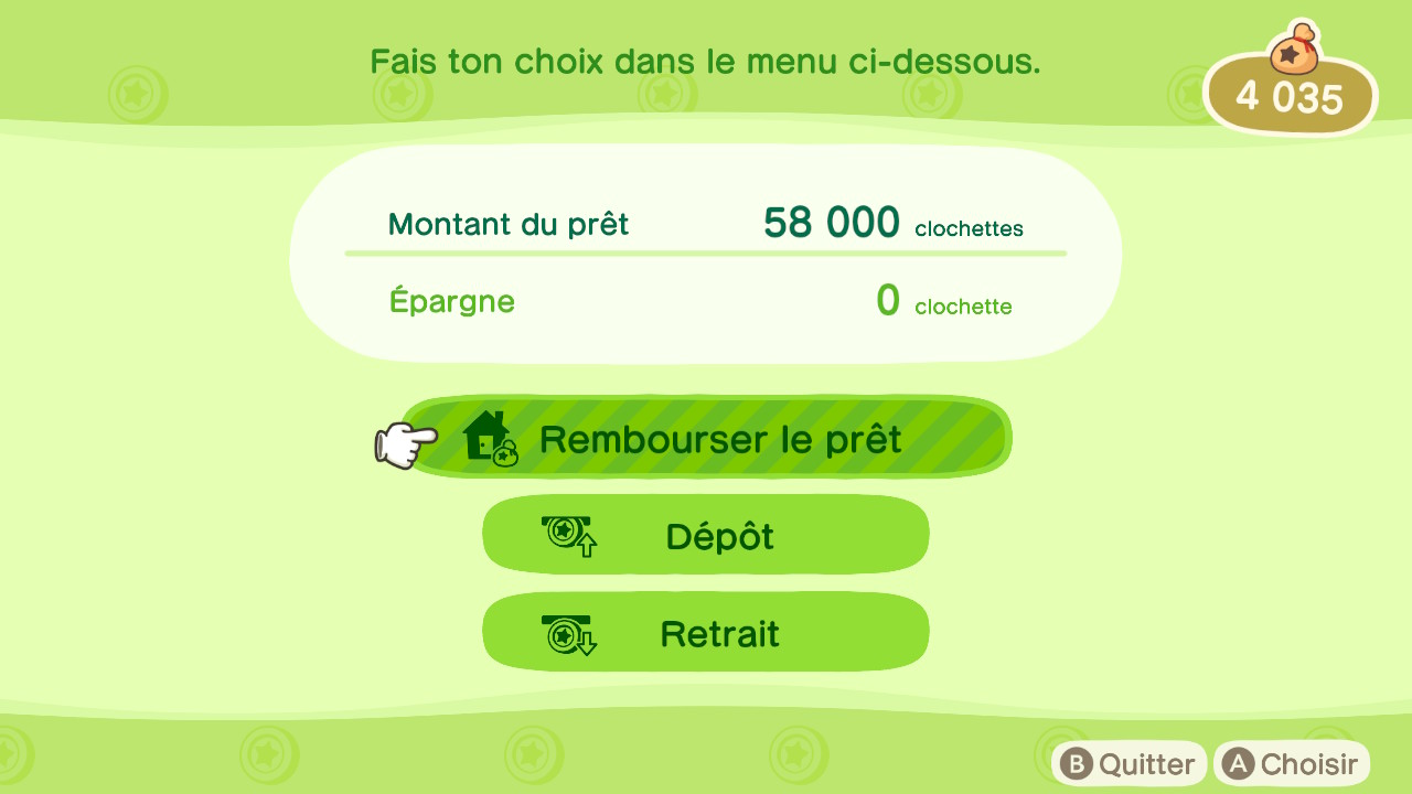 Pour rembourser ces prêts, c'est très simple ! Vous devrez vous rendre au Nook Stop, la borne du Bureau des résidents, pour accéder au DAC, le Distributeur Automatique de Clochettes. C'est là que vous sera proposé le remboursement du prêt, que vous pourrez réaliser en plusieurs fois ! Il n'y a d'ailleurs pas de date limite pour les rembourser, vous pouvez y aller à votre rythme.