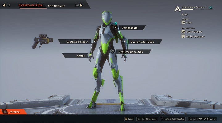 Comme tous les javelins, l'intercepteur a la possibilité de s'équiper de composants boostant ses statistiques et ses compétences.