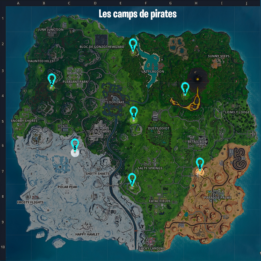 Si vous ne savez toujours pas avec exactitude où se trouvent les différents camps de pirate introduits lors de la saison 8 de Fortnite, nous vous avons préparé une petite carte qui vous permettra de les trouver facilement.