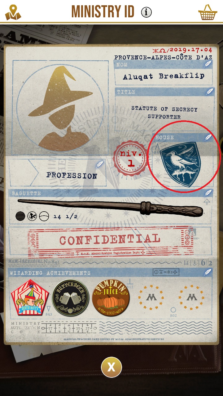 Choisir votre maison n'a rien de bien difficile. Il vous suffit, lorsque vous êtes sur l'écran principal, d'appuyer sur le bouton en bas à gauche qui vous renverra votre Ministry ID (capture d'écran 1). Une fois dedans, vous aurez alors accès à de nombreuses fonctionnalités, dont votre maison de Poudlard, en haut à droite (capture d'écran 2). Lorsque vous faites cela pour la première fois, une petite aide vous aidera à vous remémorer les caractéristiques des différentes maisons, et il vous suffira alors d'appuyer sur le blason que vous souhaitez pour rejoindre une maison (capture d'écran 3).