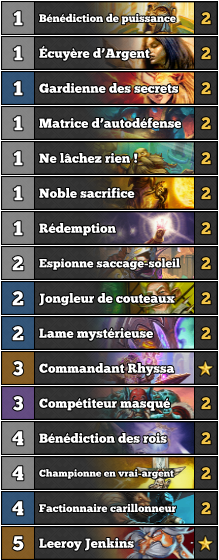 Et si la perte de Faveur Divine ne signifiait pas pour autant la mort de Paladin Aggro ? C'est en tout cas l'idée véhiculée par ce deck, qui espère que le package des secrets sera suffisant pour compenser le manque de pioche. On retrouve ici les cartes habituelles qui ont fait Paladin Aggro et qui mettent d'entrée de jeu une énorme pression. Évidemment, l'ouverture idéale d'une partie consiste à enchaîner Gardienne des secrets avec une horde de secrets et de cartes synergisant avec, tels que Espionne saccage-soleil et Lame mystérieuse. Avant d'enchaîner avec un plateau menaçant, plein de buffs, et prêt à lancer Leeroy Jenkins pour achever l'adversaire.
