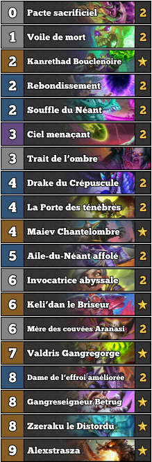 Pour se faire on retrouvera ainsi en début de partie le Voile de mort, le Trait de l'ombre ainsi que des cartes arrivées avec L'Envol des Dragons comme Souffle du néant et Ciel menaçant. À partir du quatrième tour il sera conseillé de commencer à développer des créatures comme le Drake du crépuscule, l'Invocatrice abyssale tout en continuant à contrôler le board avec Maiev Chantelombre ou l'Aile-du-néant affolée par exemple. La Porte des ténèbres sera également présente pour permettre de générer des cartes puissantes à coût réduit. La fin de la partie sera le domaine de prédilection du Démoniste Handlock qui pourra ainsi développer la Dame de l'effroi améliorée et Zzeraku le Distordu pour déborder l'adversaire avec des cartes imposantes.
