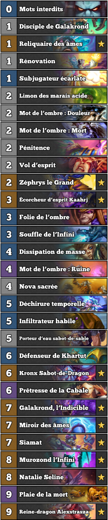 Le Prêtre est une de ces classes, comme le Chasseur ou le Guerrier, dont l'archétype Highlander semble toujours efficace pour cette extension des Cendres de l'Outreterre. Le deck repose toujours sur l'utilisation de Galakrond, l'Indicible, introduit avec L'Envol des Dragons mais aussi des outils classiques du Prêtre, à savoir la gestion de board et le vol de ressources de l'adversaire.